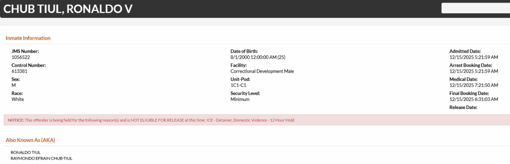 25-year-old Ronaldo V. Chub Tiul – arrested December 15