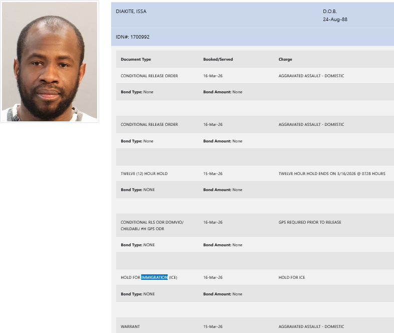 - Diakite was charged with aggravated domestic assault. He was booked with no bond.