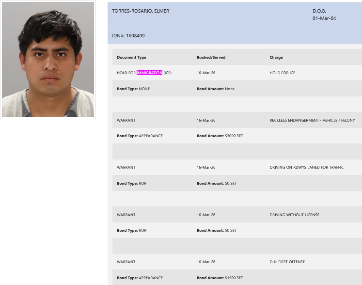 - Torres-Rosario was charged with DUI (first offense), reckless endangerment (vehicle), driving on roadways laned for traffic, and driving without a license. He was booked on a $4500 total bond.
