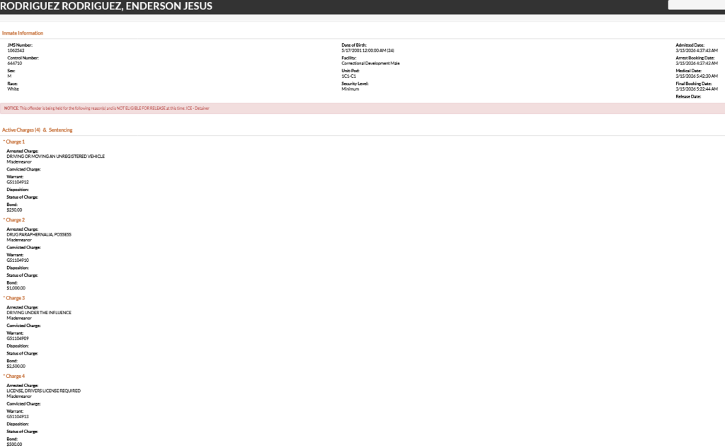 - Rodriguez was charged with driving or moving an unregistered vehicle, possession of drug paraphernalia, driving under the influence, and driver’s license required. He was booked on a $4250 total bond.