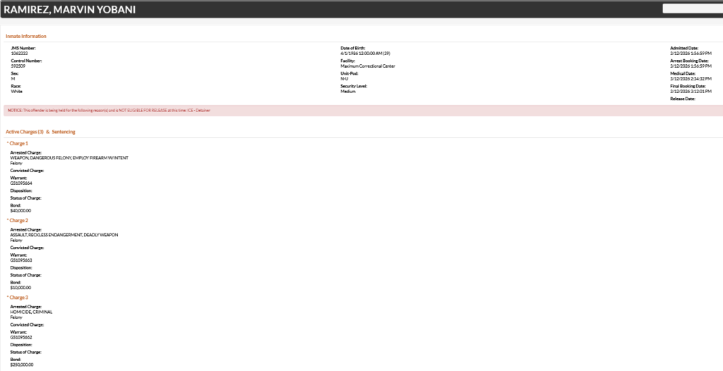 - Ramirez was charged with employing a firearm during a dangerous felony, assault with reckless endangerment with a deadly weapon, and attempted criminal homicide. He was booked on a $300,000 total bond. The arrest comes several months after the incident that occurred on November 2, 2025, during which Ramirez allegedly shot a man in the leg at a Super 8 Motel on Murfreesboro Pike during an argument over an alleged affair.