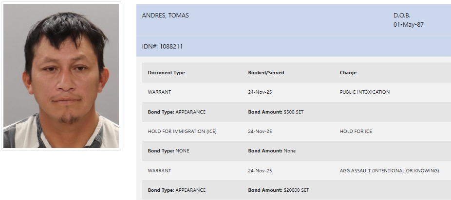 In Knox County, 38-year-old Tomas Andres was arrested on Monday, November 24. He was charged with public intoxication and aggravated assault and was booked on a $20,500 bond.