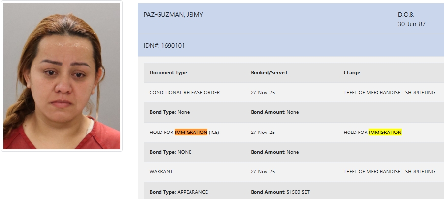 38-year-old Jeimy Paz-Guzman was arrested on Thursday, November 27. She was charged with theft of merchandise (shoplifting) and was booked on a $1500 bond.