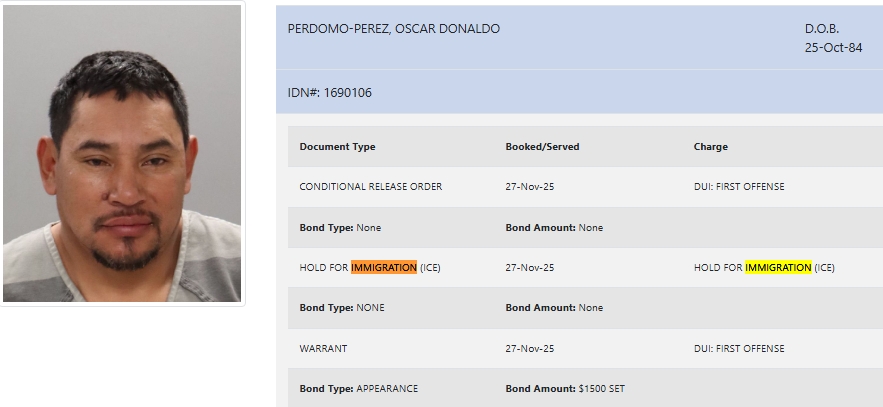 41-year-old Oscar Donaldo Perdomo-Perez was also arrested on November 27 and charged with DUI: first offense. He was booked on a $1500 bond.