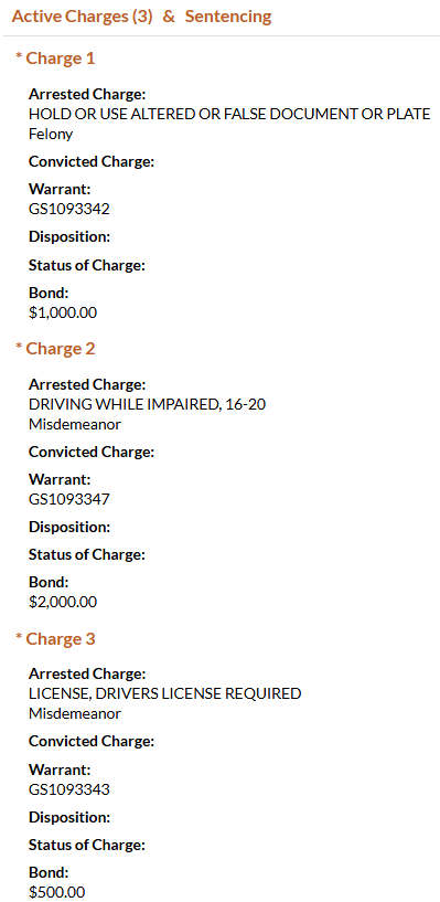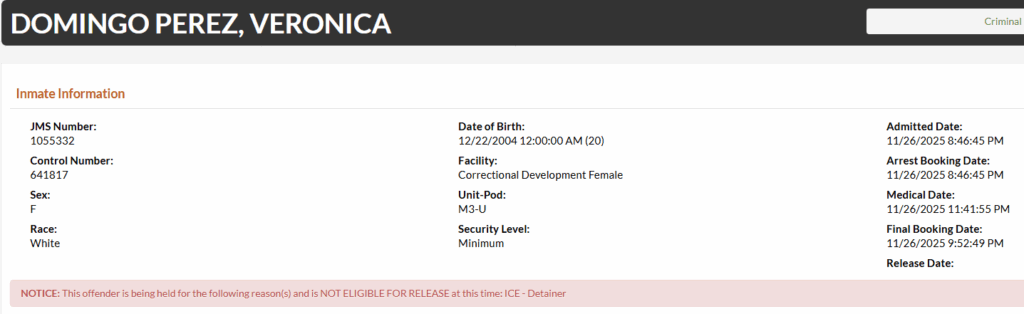 20-year-old Veronica Domingo Perez was also arrested on November 26 and charged with driving while impaired (age 16-20), driver’s license required, and hold/use altered or false document or plate. She was booked on a $3500 bond.