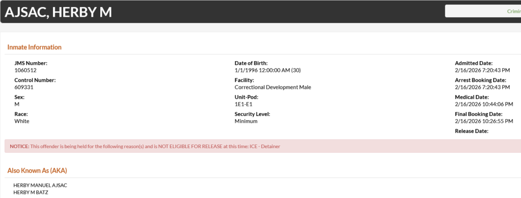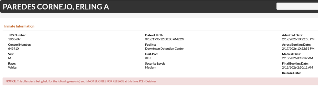 29-year-old Erling A. Paredes Cornejo – arrested February 17