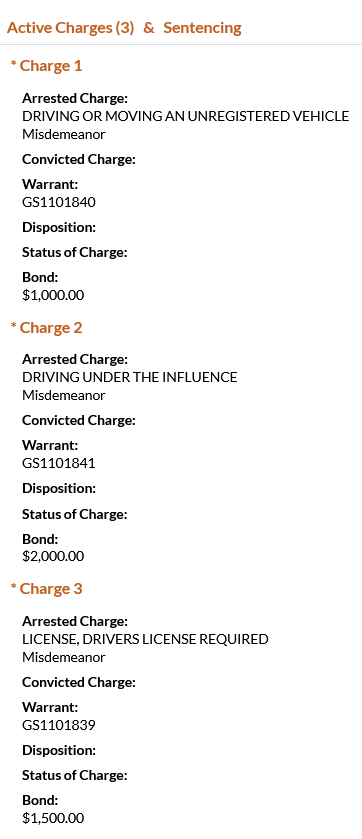 - Chow was charged with driving under the influence, driving or moving an unregistered vehicle, and driver’s license required. He was booked on a $4500 bond.