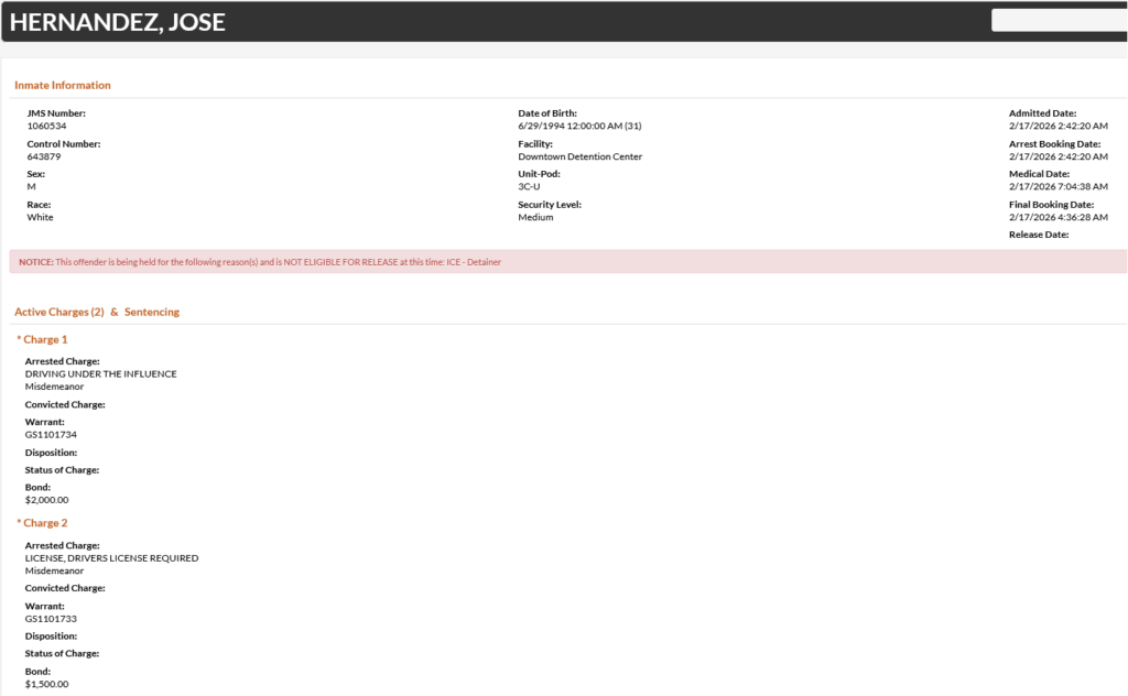 - Hernandez was charged with driving under the influence and driver’s license required. He was booked on a $3500 bond.