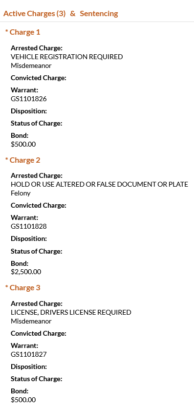 - Cornejo was charged with vehicle registration required, driver’s license required, and hold or use altered or false document or plate. He was booked on a $3500 bond.
