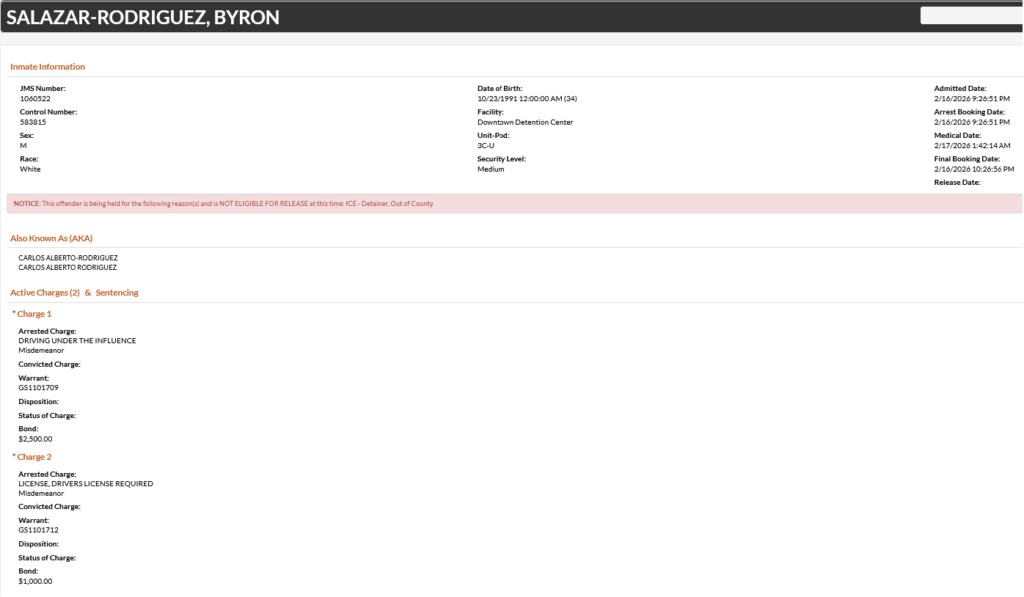 - Salazar-Rodriguez was charged with driving under the influence and driver’s license required. He was booked on a $3500 bond.