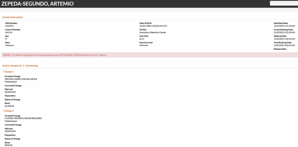 - Zepeda-Segundo was charged with driving under the influence and driver’s license required. He was booked on a $1500 total bond.