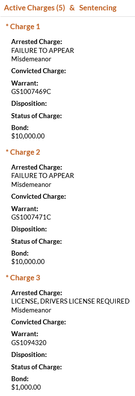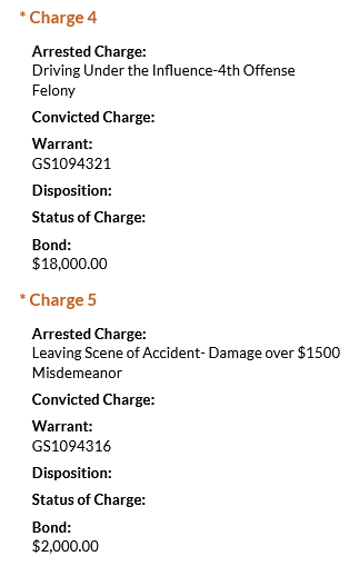 - Rodriguez was charged with two counts of failure to appear, driving under the influence (4th offense), leaving the scene of an accident with damage over $1500, and driver’s license required. He was booked on a $41,000 total bond. Rodriguez has numerous previous charges related to driving under the influence, violating the open container law, and other incidents that date back to 2009.