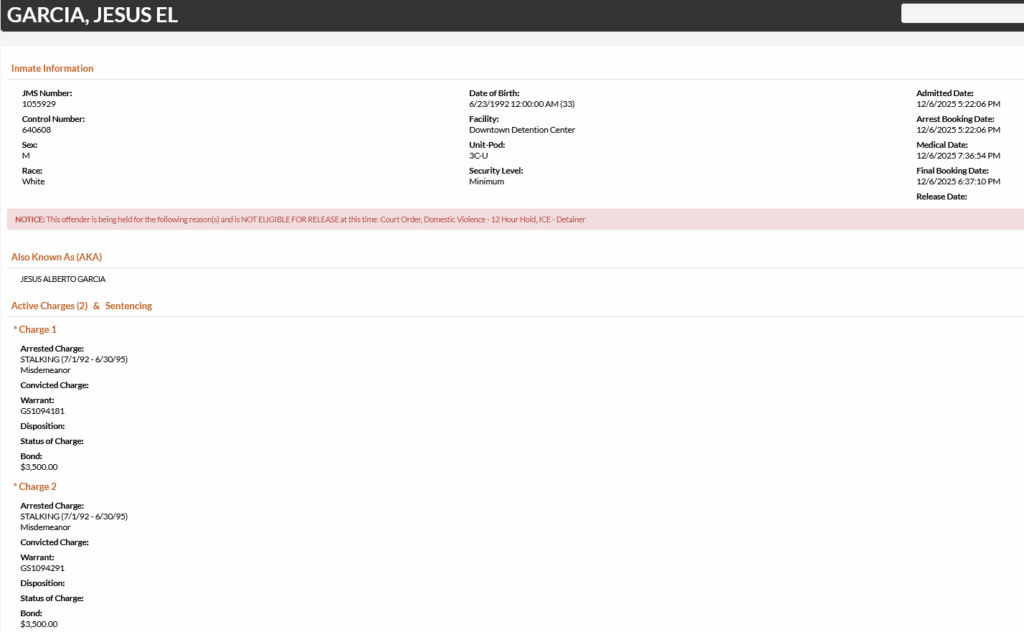 - Garcia was charged with two counts of stalking. He was booked on a $7000 total bond. He was previously charged with stalking in October but that case was closed.