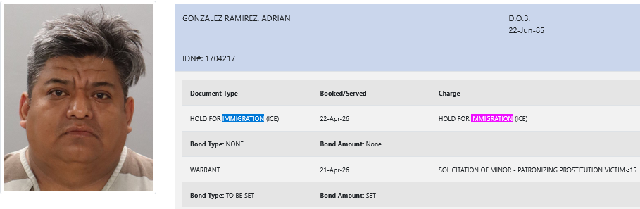 - Ramirez was charged with solicitation of a minor/patronizing prostitution with a victim <15. He was booked with a bond to be set.