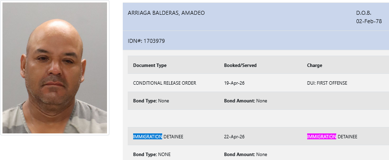 - Balderas was charged with DUI (first offense). He was booked without bond.