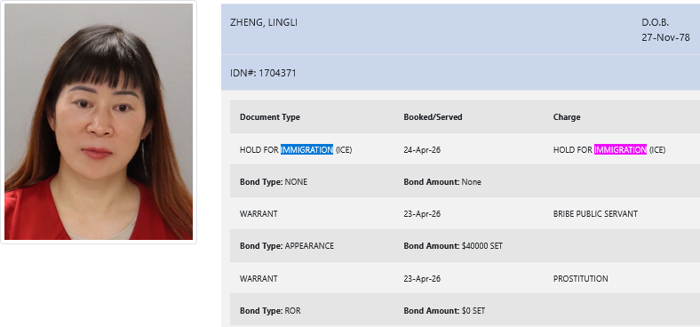 - Zheng was charged with prostitution and bribery of a public servant. She was booked on a $40,000 bond.