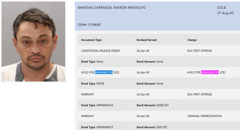 - Banegas-Carranza was charged with DUI (first offense) and criminal impersonation. He was booked on a $2500 bond.