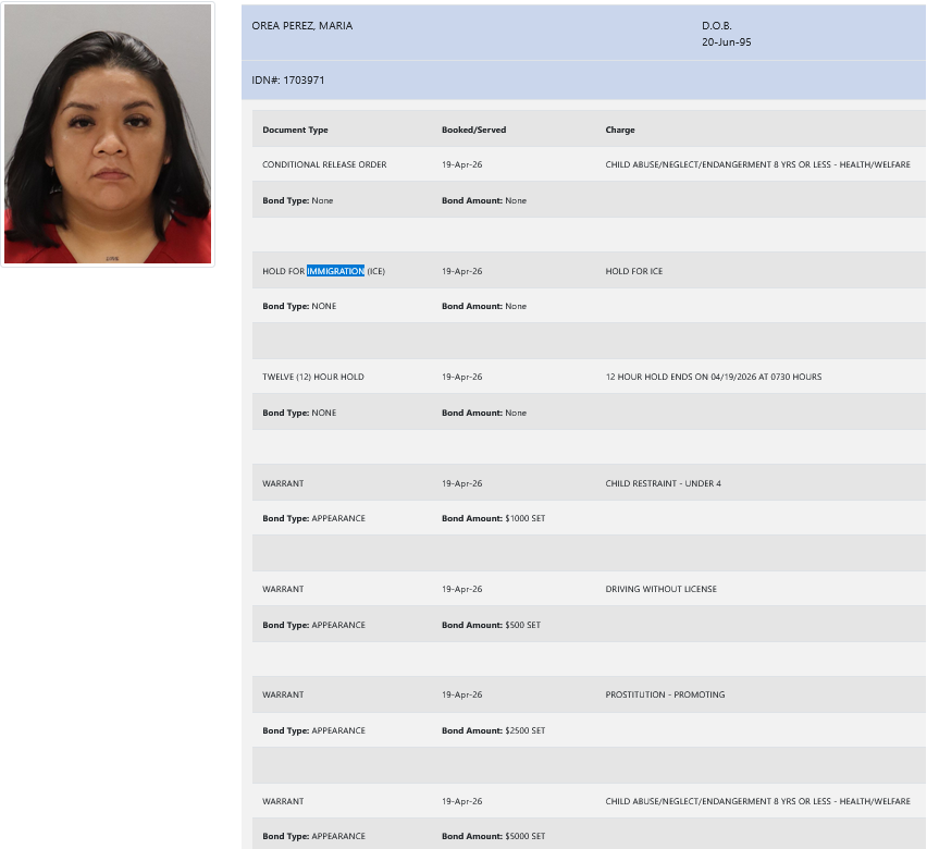 - Perez was charged with promoting prostitution, child abuse/neglect/endangerment (age 8 or less), child restraint (under age 4), and driving without a license. She was booked on a $9000 bond.