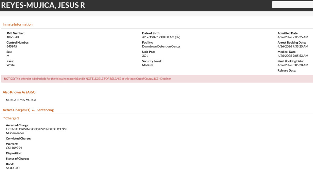 - Reyes-Mujica was charged with driving on a suspended license. He was booked on a $1000 bond.