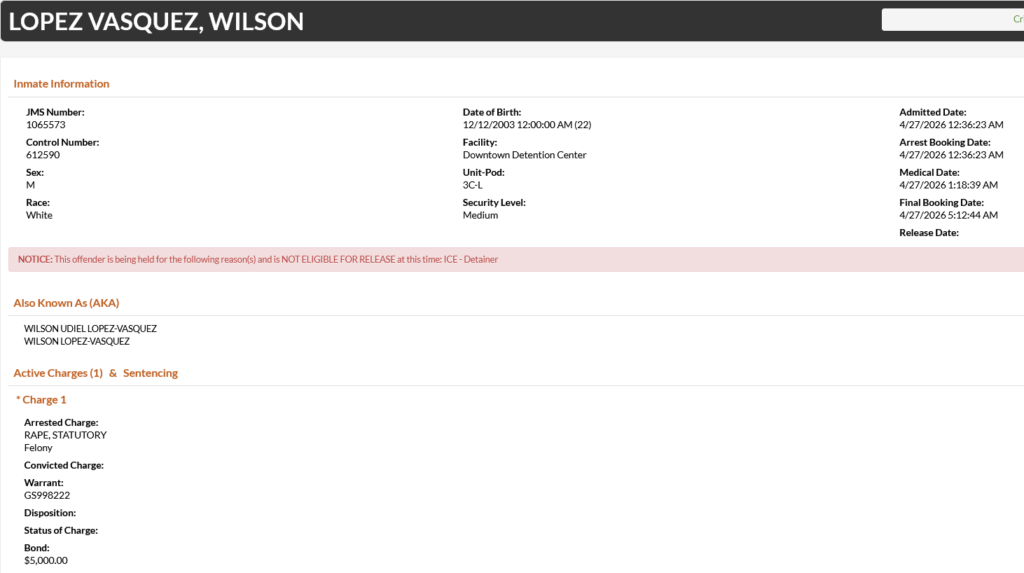 22-year-old Wilson Lopez Vasquez – arrested April 27