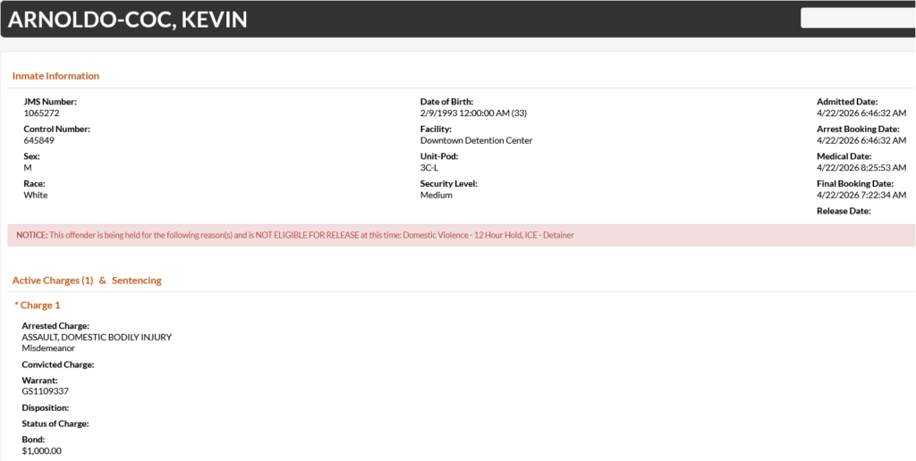 - Arnoldo-Coc was charged with domestic assault with bodily injury. He was booked on a $1000 bond.