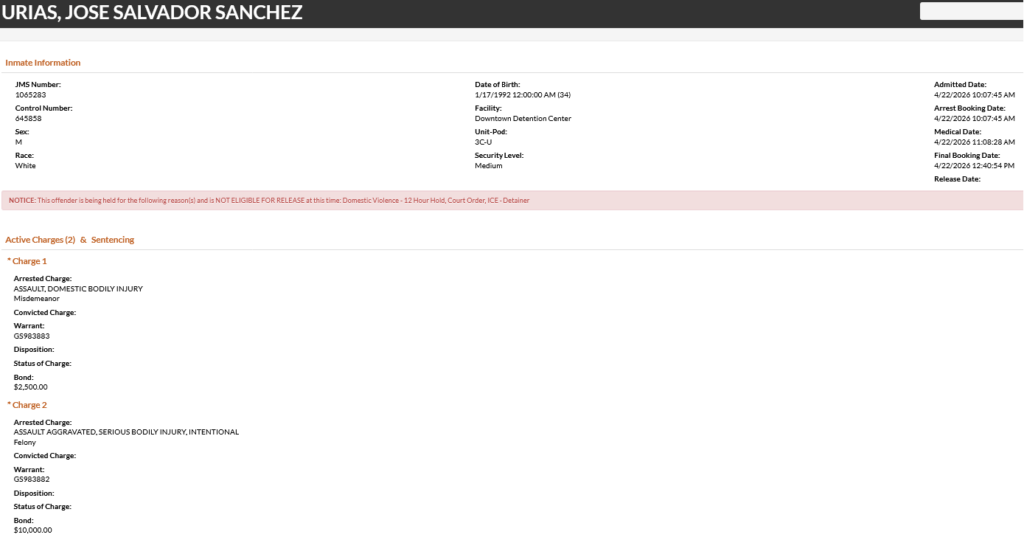 - Urias was charged with domestic assault with bodily injury and intentional aggravated assault with serious bodily injury. He was booked on a $12,500 total bond.