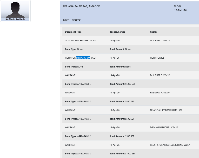 - Balderas was charged with DUI (first offense), registration law, financial responsibility law, driving without a license, and resisting stop/arrest/search. He was booked on a $7500 bond.