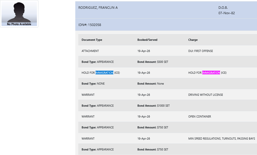 - Rodriguez was charged with DUI (first offense), open container, driving without a license, and minimum speed regulations. He was booked on a $2500 bond.