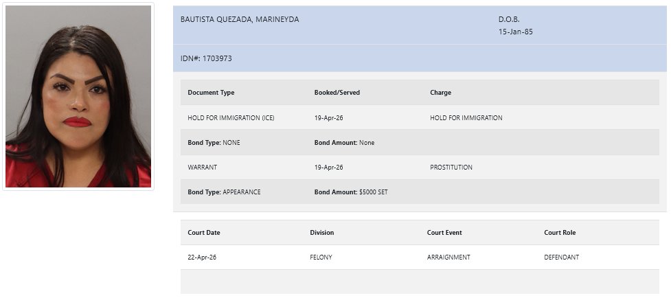 - Quezada was charged with prostitution. She was booked on a $5000 bond.