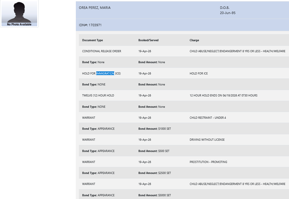 - Perez was charged with promoting prostitution, child abuse/neglect/endangerment (age 8 or less), child restraint law (under 4), and driving without a license. She was booked on a $9000 bond.