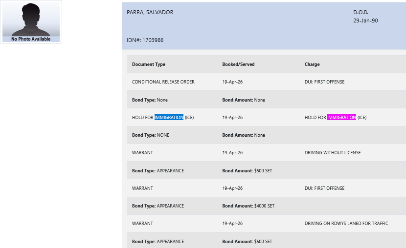- Parra was charged with DUI (first offense), driving without a license, and driving on roadways laned for traffic. He was booked on a $5000 bond.