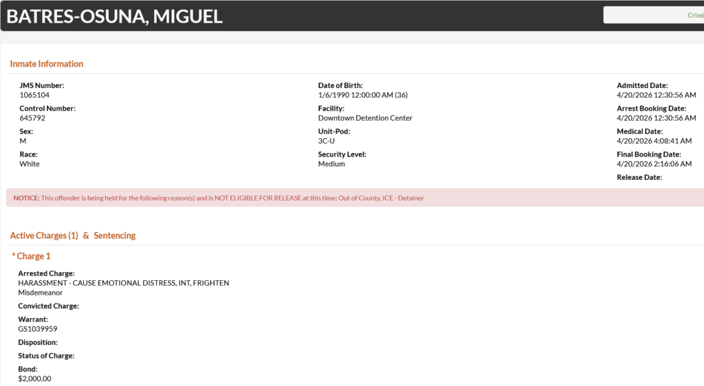 - Batres-Osuna was charged with harassment. He was booked on a $2000 bond.