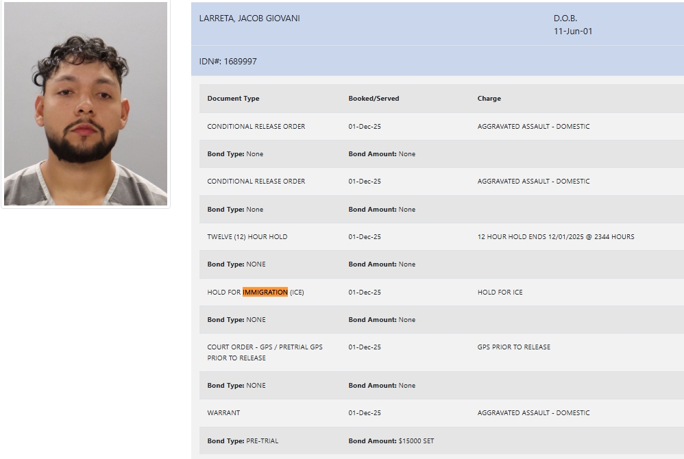 24-year-old Jacob Giovani Larreta was arrested in Knox County on Monday. He is charged with aggravated domestic assault and is being held on a $15,000 bond.