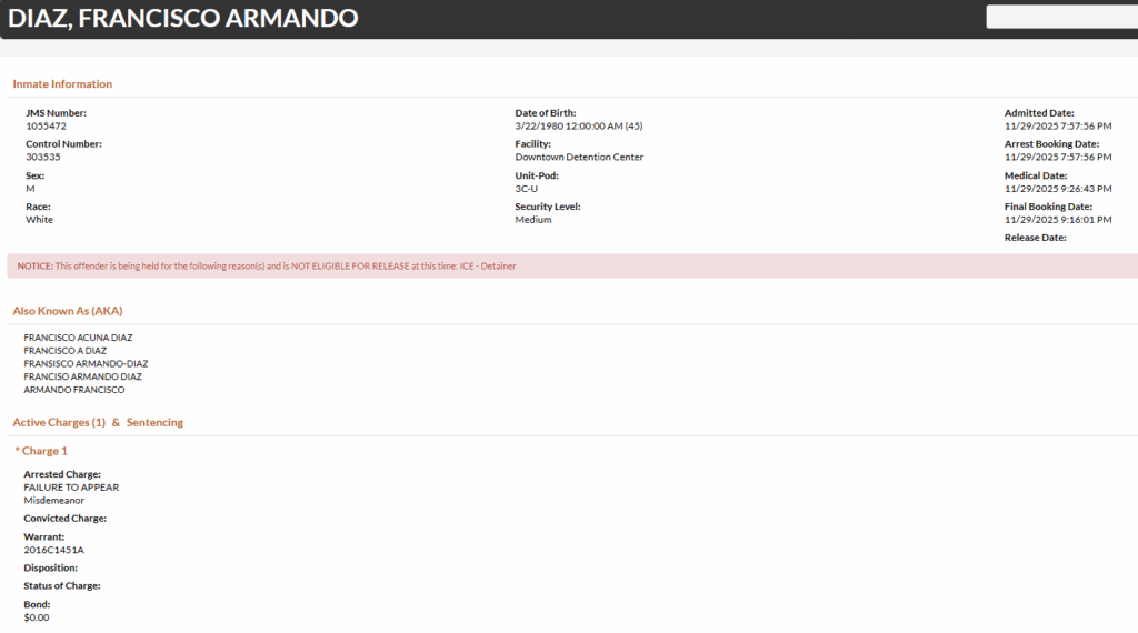 Davidson County police arrested 45-year-old Francisco Armando Diaz on Saturday, November 29. He was charged with failure to appear in relation to an indictment of stalking and aggravated assault (strangulation) from 2016. He also has numerous previous charges of no driver’s license, dating back to 2004. He was booked with no bond.