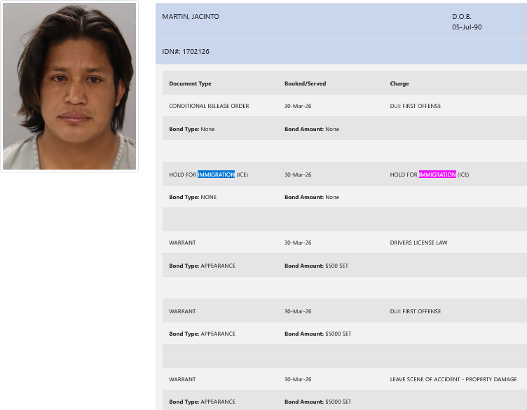 - Martinez-Marin was charged with violation of probation stemming from a 2022 conviction for DUI. He was booked on a $25,000 bond.