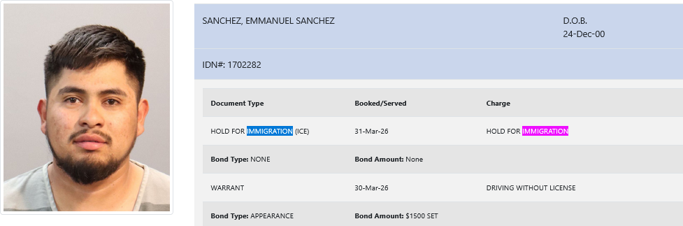 - Sanchez was charged with driving without a license. He was booked on a $1500 bond.