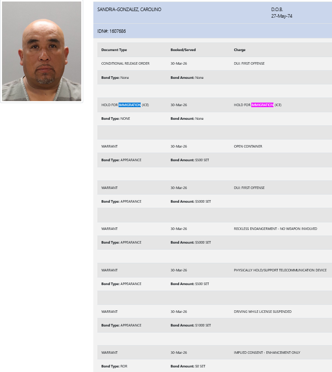 - Sandria-Gonzalez was charged with DUI (first offense), open container, reckless endangerment, and physically holding a telecommunications device. He was booked on an $11,000 total bond.