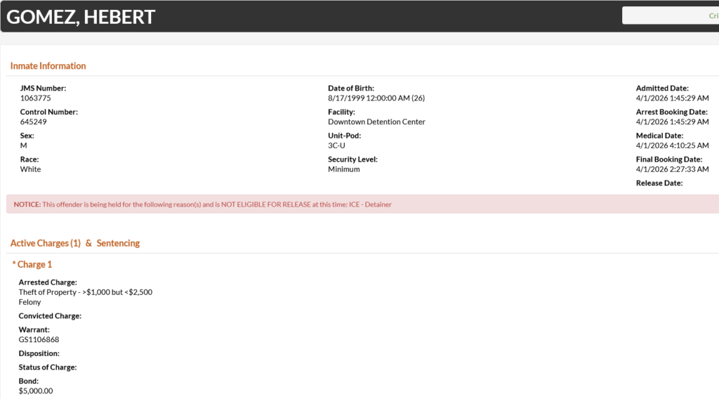 - Gomez was charged with theft of property ($1000-$2500). He was booked on a $5000 bond.