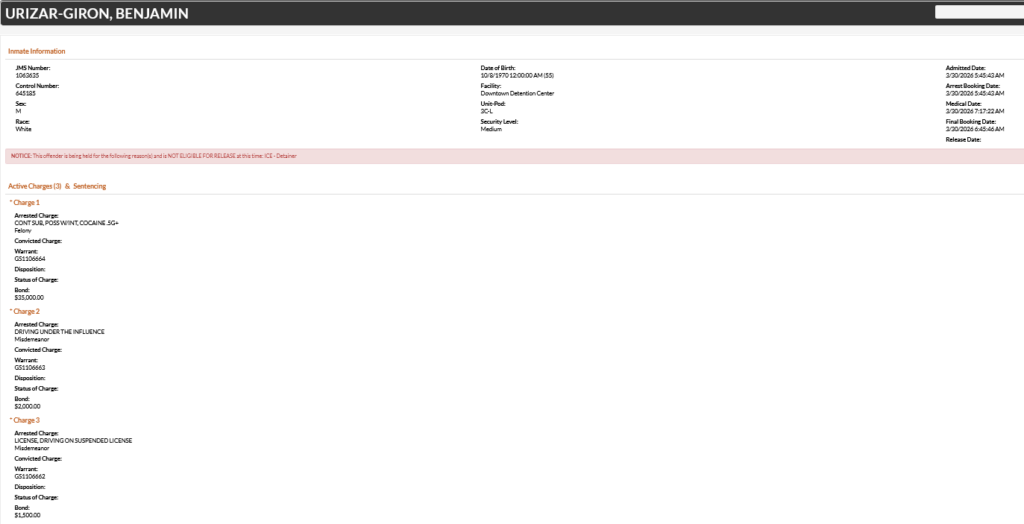 - Urizar-Giron was charged with possession of a controlled substance (cocaine), driving under the influence, and driving on a suspended license. He was booked on a $38,500 total bond.