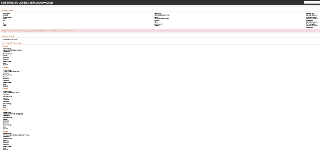 - Castenada-Lomeli was charged with domestic assault with bodily injury, driving under the influence, open container violation, driver’s license required, and failure to yield to an emergency vehicle. He was booked on a $5500 total bond.