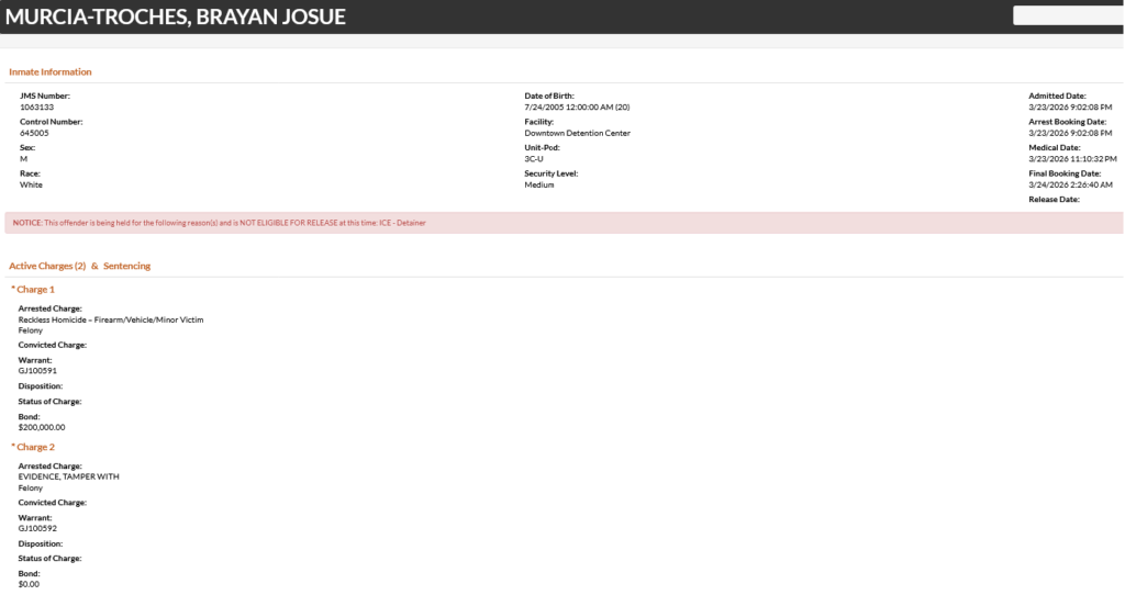 20-year-old Brayan Josue Murcia-Troches – arrested March 23