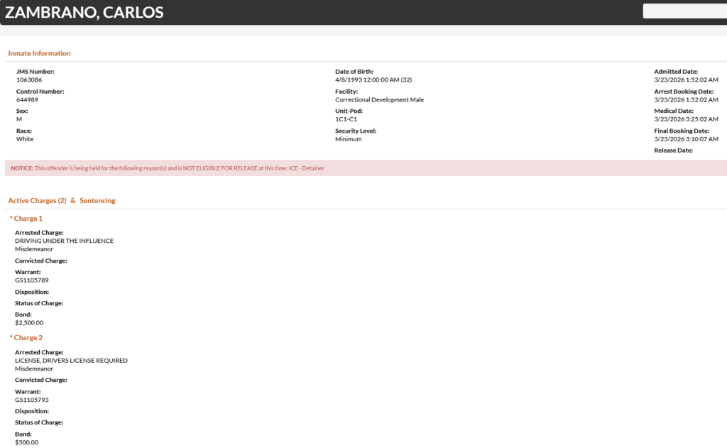 32-year-old Carlos Zambrano – arrested March 23