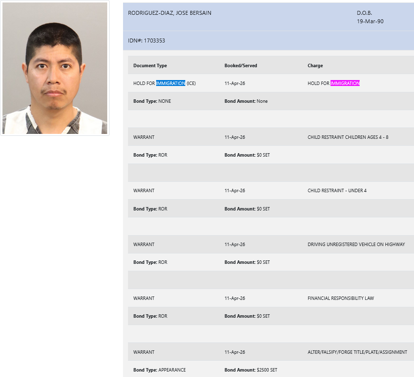 - Rodriguez-Diaz was charged with driving an unregistered vehicle on the highway, child restraint under age 4, child restrain ages 4-8, altering/falsifying/forging a title/plates, and financial responsibility law. He was booked on a $2000 bond.