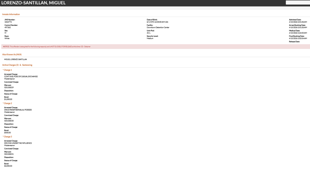 - Lorenzo-Santillian was charged with possession/casual exchange of a controlled substance, possession of drug paraphernalia, and driving under the influence. He was booked on a $3500 bond.