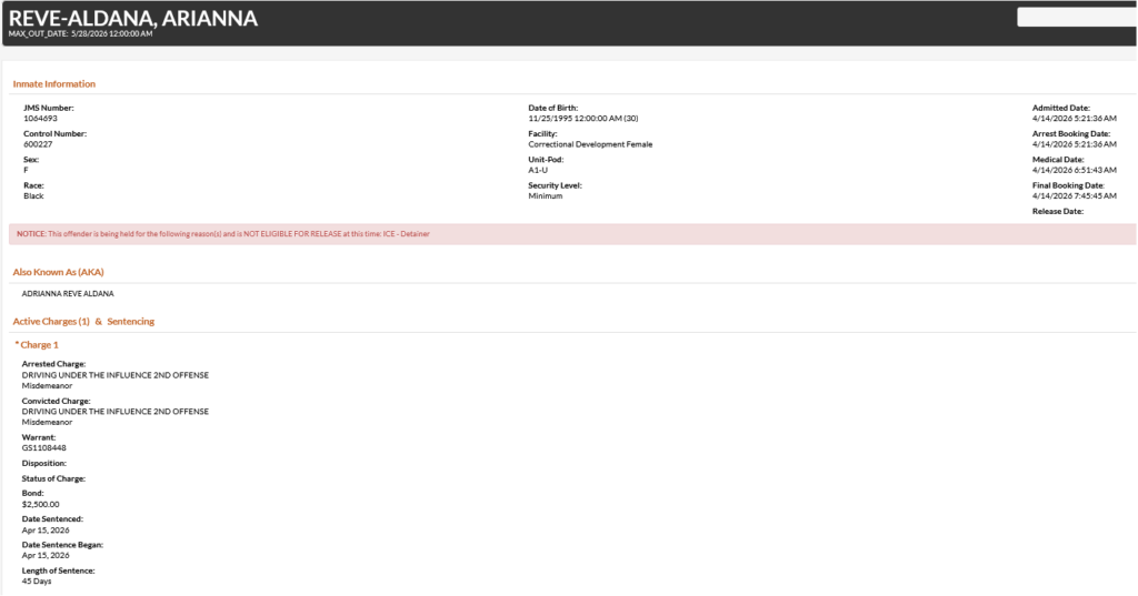 - Reve-Aldana was charged with driving under the influence (2nd offense). She was booked on a $2500 bond but then was sentenced on April 15 to 45 days in jail.