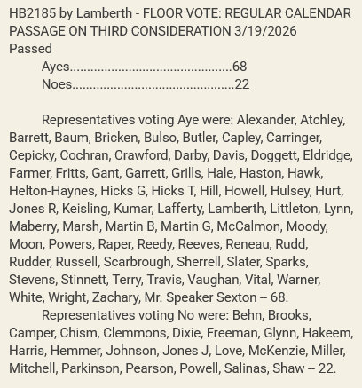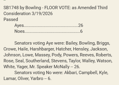 The new version of the bill passed the Senate 26-6 along party lines. The House companion, HB1817, is scheduled for the House Finance, Ways, and Means Subcommittee for Wednesday, March 25. HB1817 also shows the same amended language removing the employer consequences as its Senate counterpart.