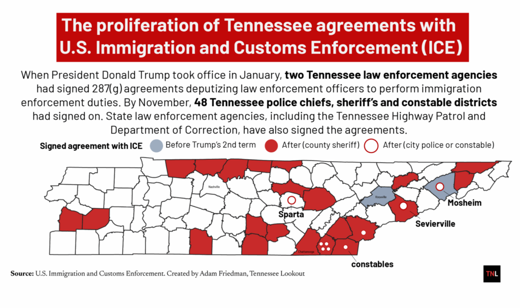 Today, 48 local and state law enforcement agencies in Tennessee have signed onto so-called 287(g) agreements with Immigration and Customs Enforcement, or ICE.