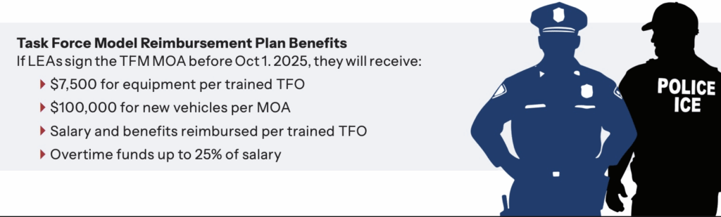 “By joining forces with ICE, you’re not just gaining access to these unprecedented reimbursement opportunities — you’re becoming part of a national effort to ensure the safety of every American family,” Madison Sheahan, ICE Deputy Director, said in a message to potential state and local partners.