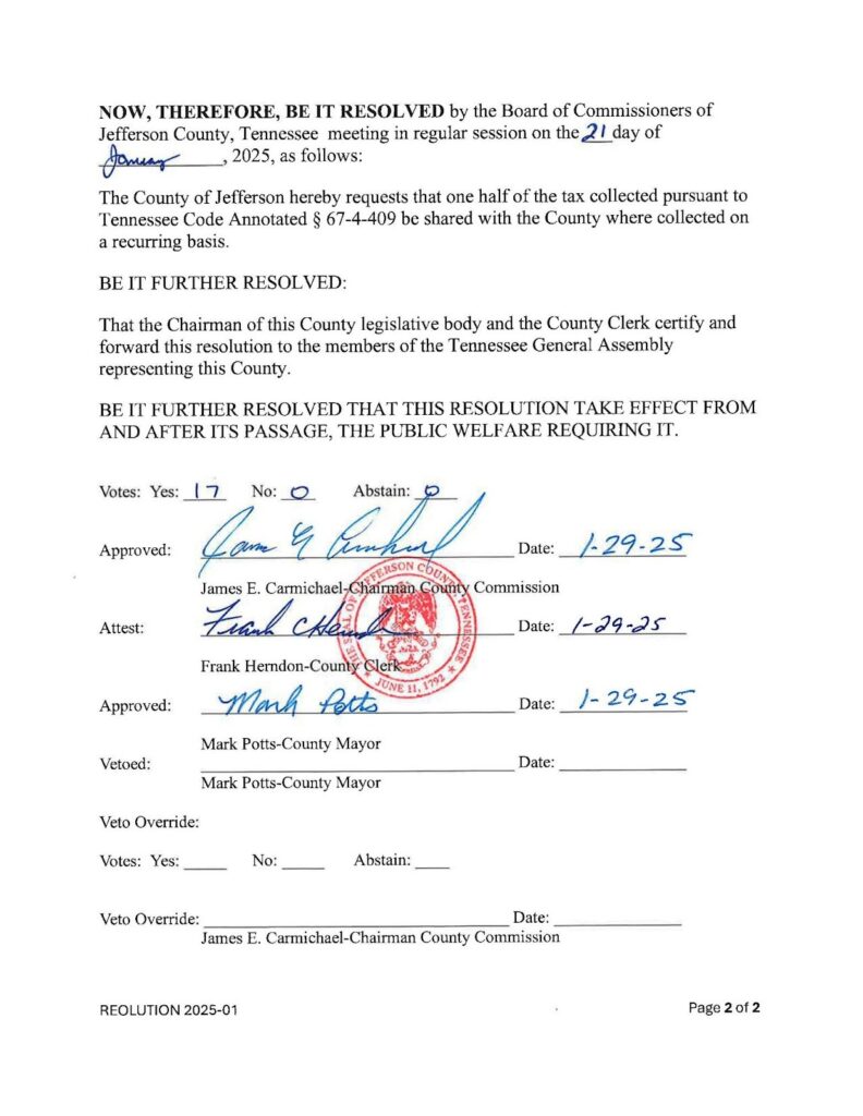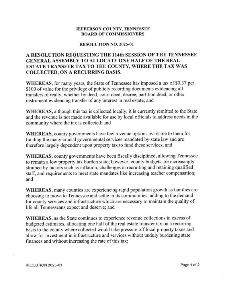 Jefferson County, Tennessee County Commission unanimously passed a resolution in January formally asking the legislature to return 50% of the Real Estate Transfer Tax to the county where it is collected, (Resolution 2025-1). In Jefferson County, the passage of SB1080/HB649 could mean an extra one million dollars per year of revenue that could be used on road repairs, debt service and other specified expenditures.