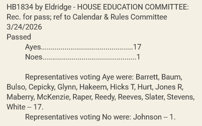 There were no questions or comments from committee members, and the vote was a 17-1 with three Democrats joining Republicans in voting “Yes”. The lone “No” vote was from Democrat Gloria Johnson.